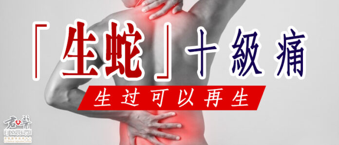 「生蛇」(Herpes Zoster/ Shingles) 即帶狀疱疹,這是一種由水痘病毒 (帶狀疱疹病毒) 引起的皮膚疾病。曾患過水痘的人,當免疫力下降時,潛伏的病毒便可能會再次出現,導致皮膚出現疼痛和水疱。帶狀疱疹多見於成年人,常常伴隨著皮膚的紅腫和灼燒感,並且可能引發神經痛。普遍「生蛇」的位置在頭 (包括: 眼睛)、頸、肩、背、腹部等。